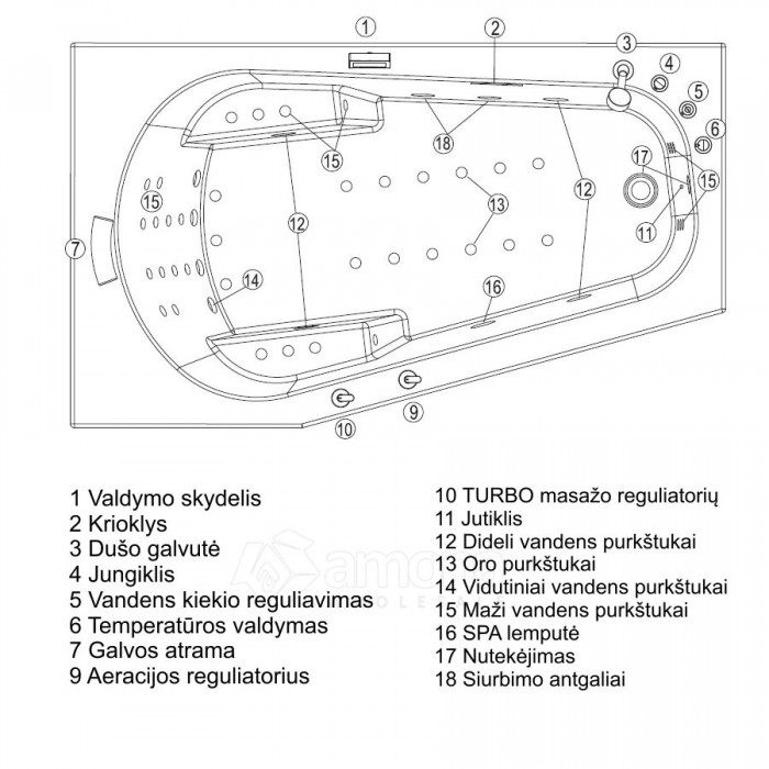 - Valdymo pultas (visas vonios valdymas, valdomas prisilietimu)