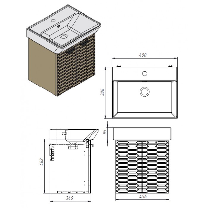 Spintelės matmenys su praustuvu 490x386x557.